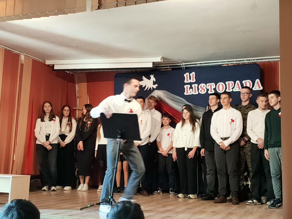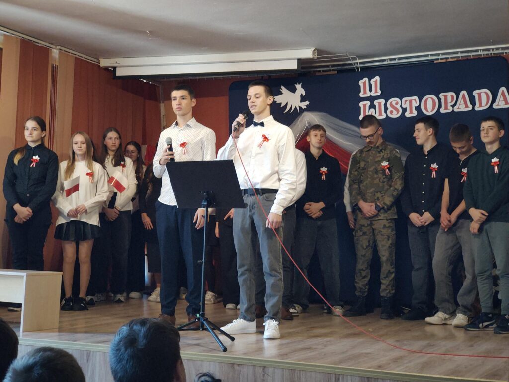 W dniu 7 listopada 2025 roku w naszej szkole odbyła się uroczysta Akademia z okazji Narodowego Święta Niepodległości, przygotowana przez uczniów klasy VIII pod kierunkiem wychowawczyni pani Justyny Żaby.Uczniowie przedstawili program artystyczny, który przypomniał najważniejsze wydarzenia z historii Polski prowadzące do odzyskania niepodległości w 1918 roku. Występ wzbogaciły wiersze patriotyczne, fragmenty tekstów historycznych oraz pieśni narodowe.Akademia była nie tylko lekcją historii, ale także wyrazem szacunku i miłości do Ojczyzny. 🌹
