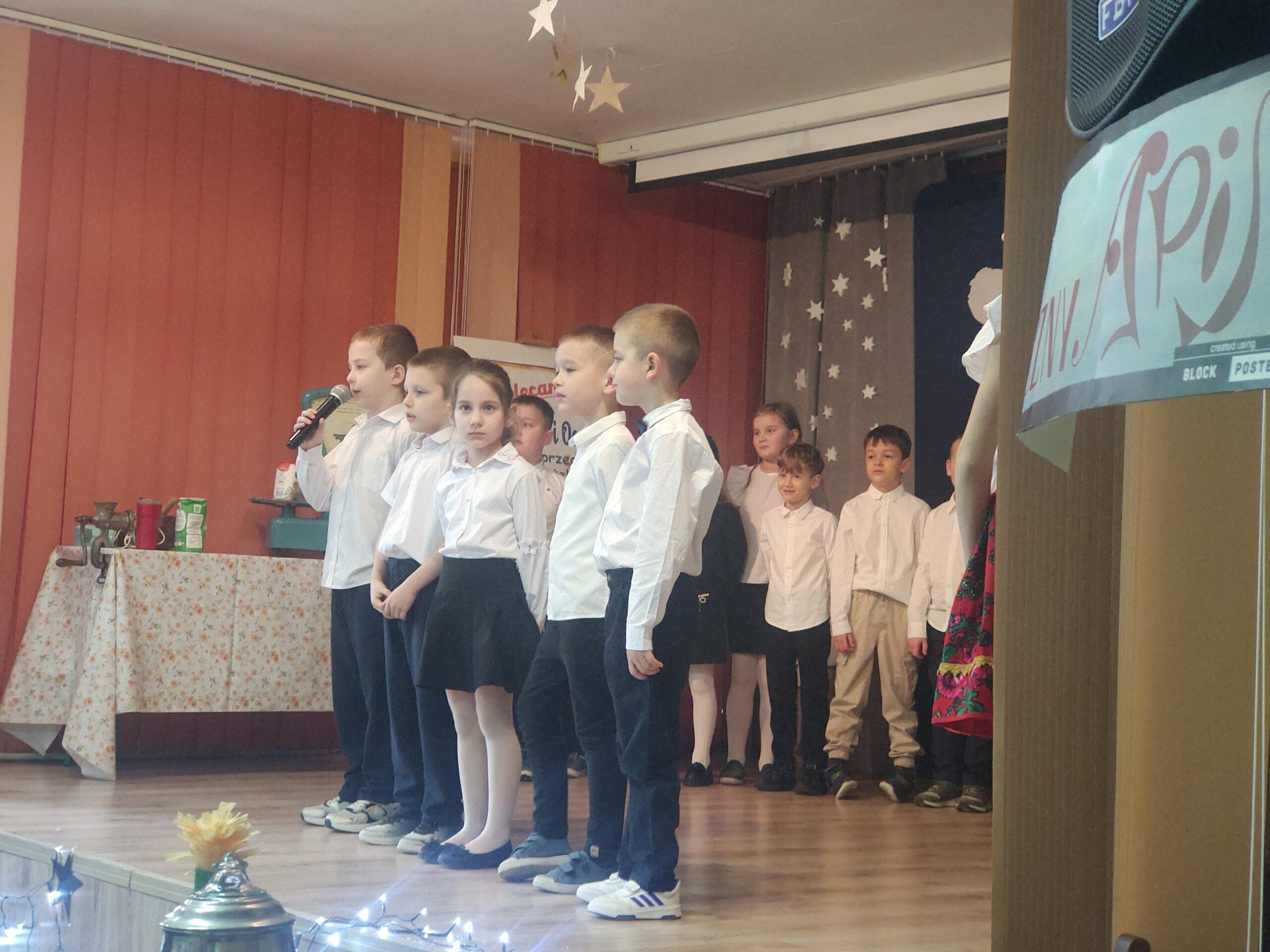 Pierwszaki przygotowane przez p. Annę Drąg z wielkim przejęciem recytowały wierszyki oraz śpiewały piosenki, wzruszając zgromadzonych gości swoją szczerością i dziecięcą radością.