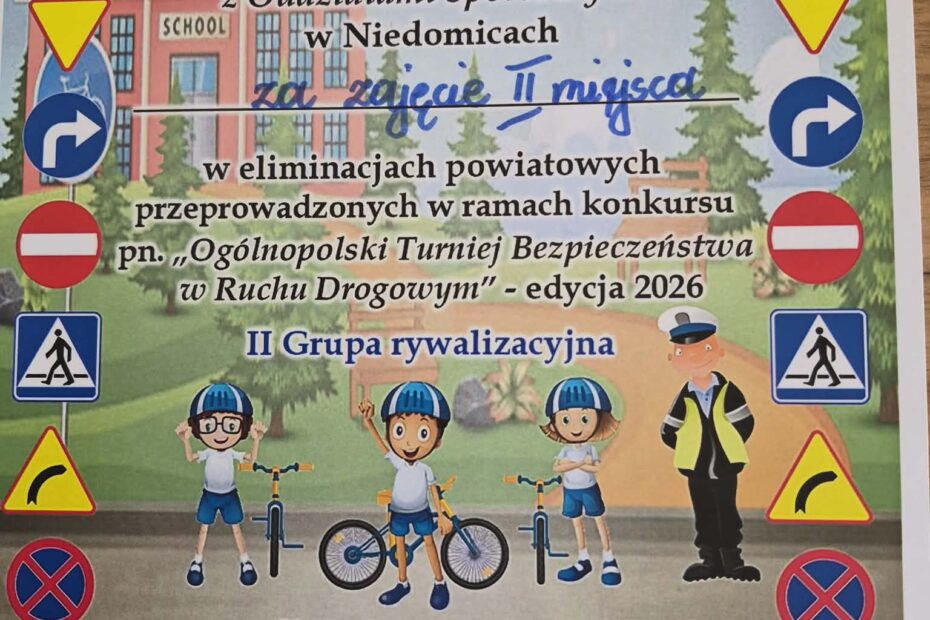 Z dumą informujemy, że drużyna ze Szkoły Podstawowej im. Polskich Olimpijczyków z Oddziałami Sportowymi w Niedomicach zajęła II miejsce w eliminacjach powiatowych Ogólnopolskiego Turnieju Bezpieczeństwa w Ruchu Drogowym 2026.Zawody odbyły się w dniach 15–16 kwietnia na terenie powiatu gorlickiego i zgromadziły najlepsze drużyny z regionu. Turniej miał na celu nie tylko sprawdzenie wiedzy uczestników, ale przede wszystkim promowanie bezpiecznych zachowań na drodze oraz umiejętności udzielania pierwszej pomocy.Uczestnicy rywalizowali w kilku wymagających konkurencjach:teście wiedzy z przepisów ruchu drogowego,jeździe sprawnościowej rowerem,zadaniach z zakresu udzielania pierwszej pomocy przedmedycznej.